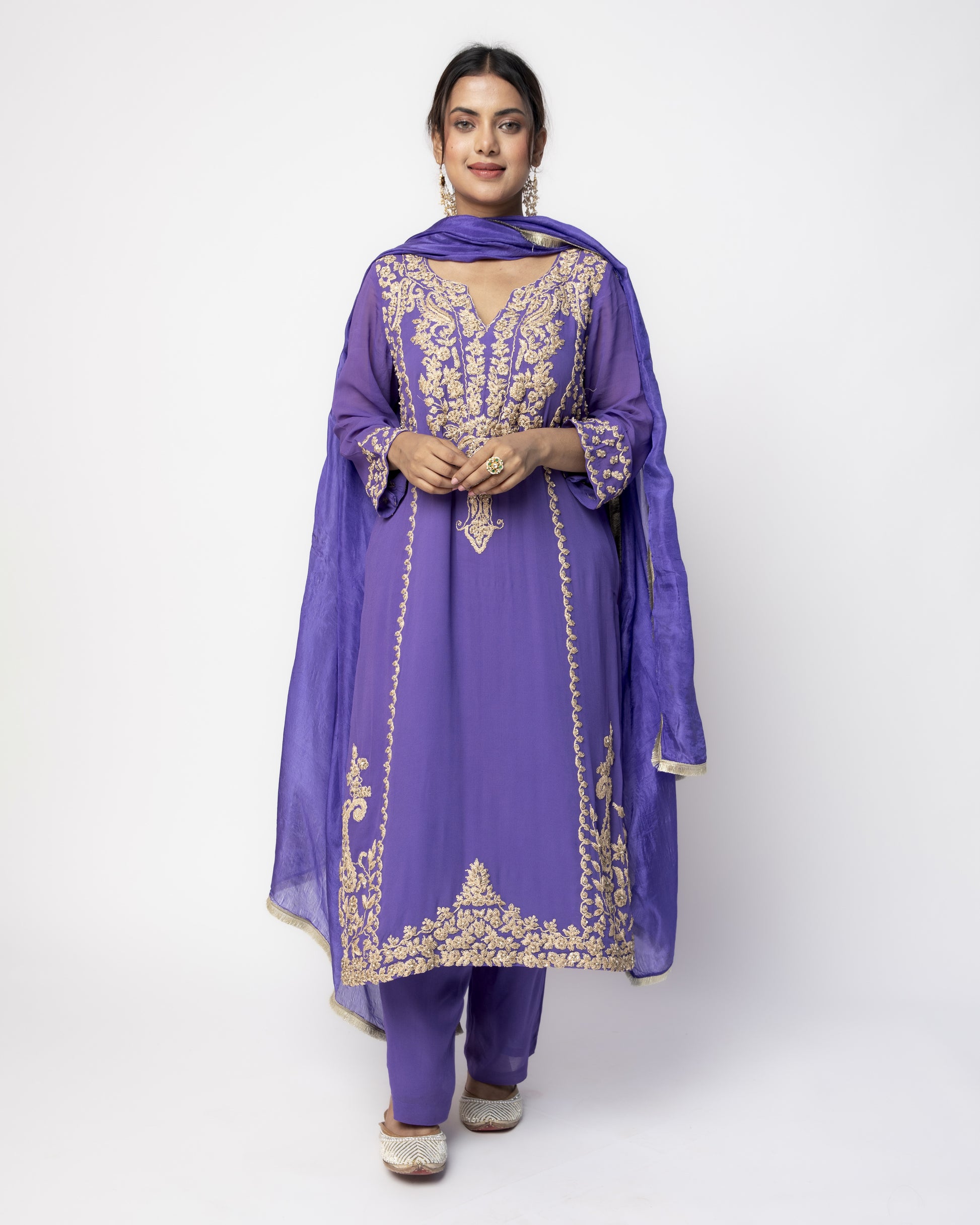 - Purple Georgette Tunic Set With Tabby Silk Dupatta Heavy Dori, Resham and Hand Embroidery on Front & Back & Sleeves